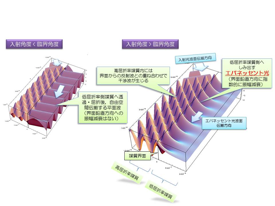前述のようにエバネッセント光は、全反射界面に局在し、自由空間を伝搬してこないため、直接観察することは原理上、困難(例えば、近接場光学顕微鏡等により微細なプローブをエバネッセント光内に挿入し、その散乱光を取得することで間接的に観察する)となる。そのため、具体的な光波の振る舞いを可視化するためには、計算機シミュレーションが用いられることが多い。図2に計算機シミュレーションにより算出したエバネッセント光電場振幅分布の一例(ここでは入射光波がS偏光時の電場振幅値をプロットし三次元的に俯瞰したもの)を示す。左には、比較のため、入射角度が臨界角度以下のときの同一時空間における電場振幅分布を示している。入射角度が臨界角度より小さいときは、低屈折率媒質内において振幅分布も一様な平面光波が、スネルの法則で決定される屈折角の方向に伝搬していく(自由空間伝搬)のに対して、入射角度が臨界角度より大きくなると、低屈折率媒質内における光波振幅は、指数的に急峻に減衰する。また、その伝搬方向は、界面方向に一致する。なお、高屈折率媒質内においては、入射光波と反射光波が共存するため、それらの重ね合わせによる干渉光波が生成される。特に、エバネッセント光生成時には、全反射により、入射・反射、両光波の光量が一致するため、界面鉛直方向に可視度1の定在波が生成される。このようにエバネッセント光は、ある瞬間で観察すると、波動としての振幅分布が明らかになるが、それらは界面方向に伝搬するため、時間平均をとって観察すると、界面方向には一様な強度分布を示す。