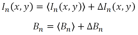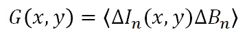 と表すことができる。ここで、〈 〉および ∆ は、アンサンブル平均および揺らぎ(平均値からの偏差)をそれぞれ意味する。このとき、光強度の揺らぎの相関分布 \( G(x, y) \) は、