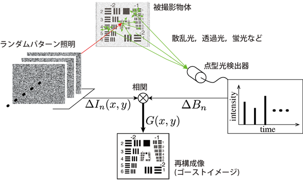 ゴーストイメージングは、イメージの算出方法と光強度検出器に特徴がある。したがって、それらに起因した利点を有している。