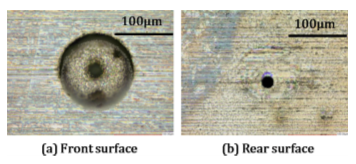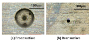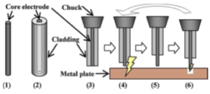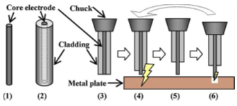 ① 図1に示すように、あらかじめ単発放電によりコアを露出させて加工に用いる[1]。加工によってコアが消耗しても、単発放電により被覆部を再除去することにより、工具交換の必要なく加工を継続できる。単発放電によりコアにダメージなく被覆部のみを除去できる電気条件は限られており、コアを未溶融で露出できる最大長さはおおよそコア径の6倍程度である[2]