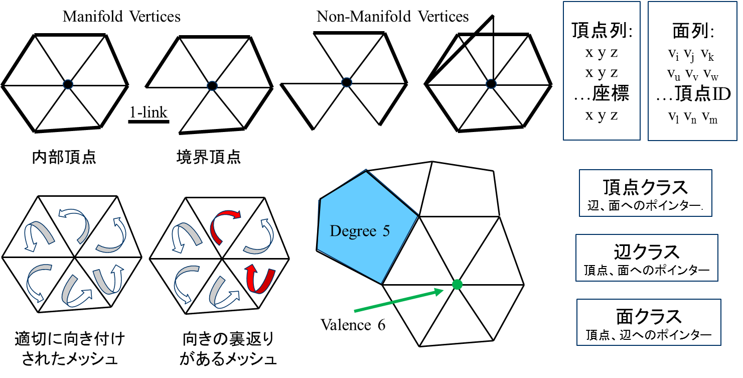 1-linkがtopological disk(高次元ではball)と同位相である頂点のみで構成されたメッシュ。境界ではhalf-diskと同位相。曲面メッシュ ( surface mesh ) で最も用いられているのは多様体である三角形メッシュである。これは、どの様な位相の曲面でも三角形分割が可能である事と三角形メッシュの面は平面であり、法線ベクトルが一意に決まる事に起因する。また、物理計算やrenderingハードウェアでの三角形メッシュに基づく方法が非常に発達している事も三角形メッシュの普及に大きく寄与している。以後、特に断りがなければメッシュは多様体であることを仮定する。