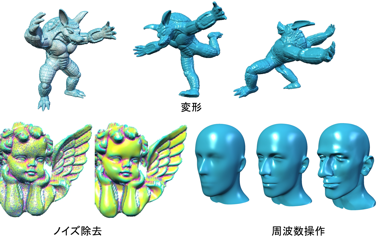 形状を幾何学的に変形する処理。FFD ( Free-Form Deformation)[34]やRBF ( Radial Basis Function ) などを使用してメッシュが埋め込まれた空間を変形するアプローチ、力学変形を簡略化する方法群や、メッシュのラプラス作用素とPoisson方程式に基づく方法群[35,36]等がある。Poisson方程式に基づく方法群は、画像や形状のseamless合成へも適用されている。