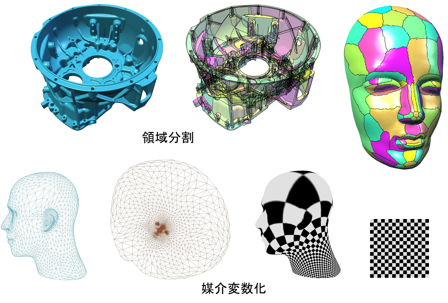 二つのメッシュ間に写像を生成する処理[42-44]。特に曲面・volumeメッシュにおいて、一次元下の多様体への写像を生成する媒介変数化は、再メッシュ化やテクスチャーマッピングなどで有用である。通常は、位相が同じ又は異なる形状間の歪(角度、面積、長さなど微分幾何学で与えられる測度による基準)が少ない写像の構成を行う。