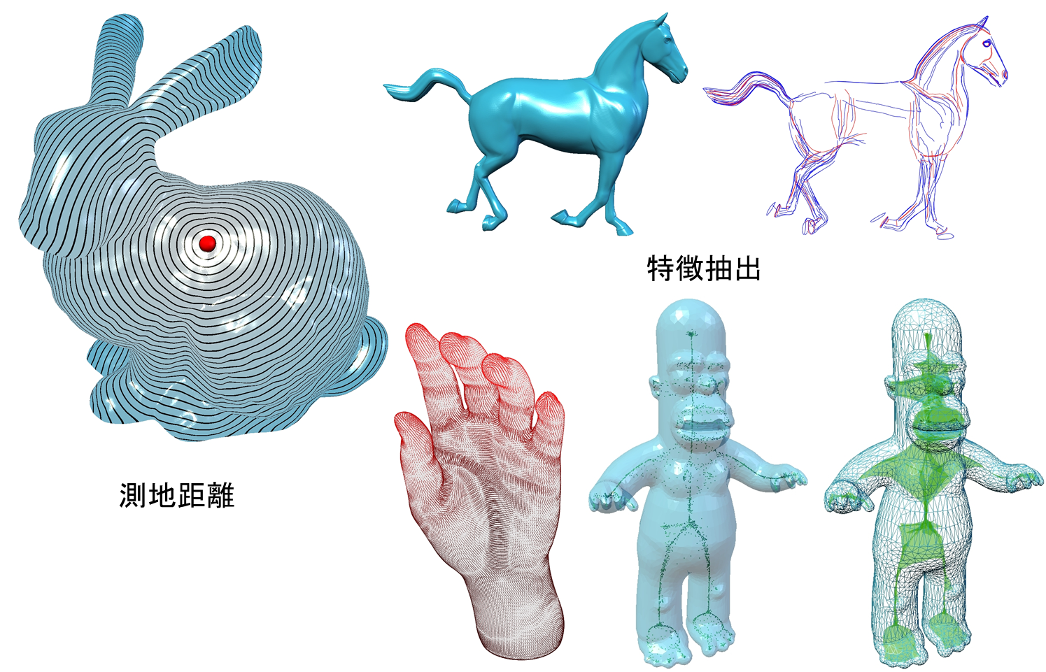 メッシュ上の二点を結ぶ最短距離・最短曲線である測地距離・測地線を計算する処理[49,50]。物理計算や形状モデリングにて様々な応用がある。