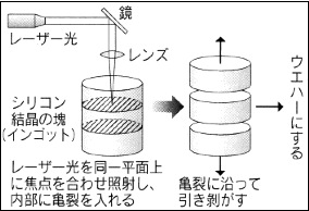 材料に対して透過性と吸収性を併せ持つレーザ光線は、材料内部で焦点を絞ることで内部加工痕を形成することができる。レーザスライシングは、スライスしたい面に沿って面状に加工痕を連続形成するため、材料剥離を可能にしている。通常、結晶材料では劈開性を利用し、アモルファス材料では熱膨張による引張応力を利用して剥離させている。