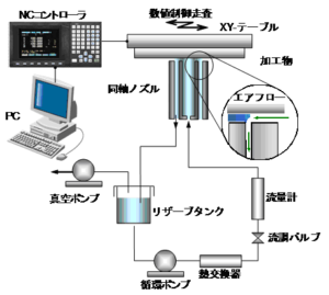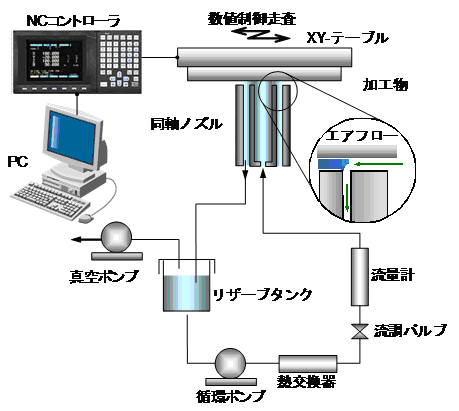 数値制御ローカルウエットエッチング装置(Numerically Controlled Local Wet Etching; NC-LWE)の概略を図1に示す。本装置は、同軸ノズルヘッド、エッチャント吸引用真空ポンプ、循環ポンプ、リザーブタンク、熱交換器、加工物もしくはノズルを相対移動させるための駆動軸およびNCコントローラから構成される。