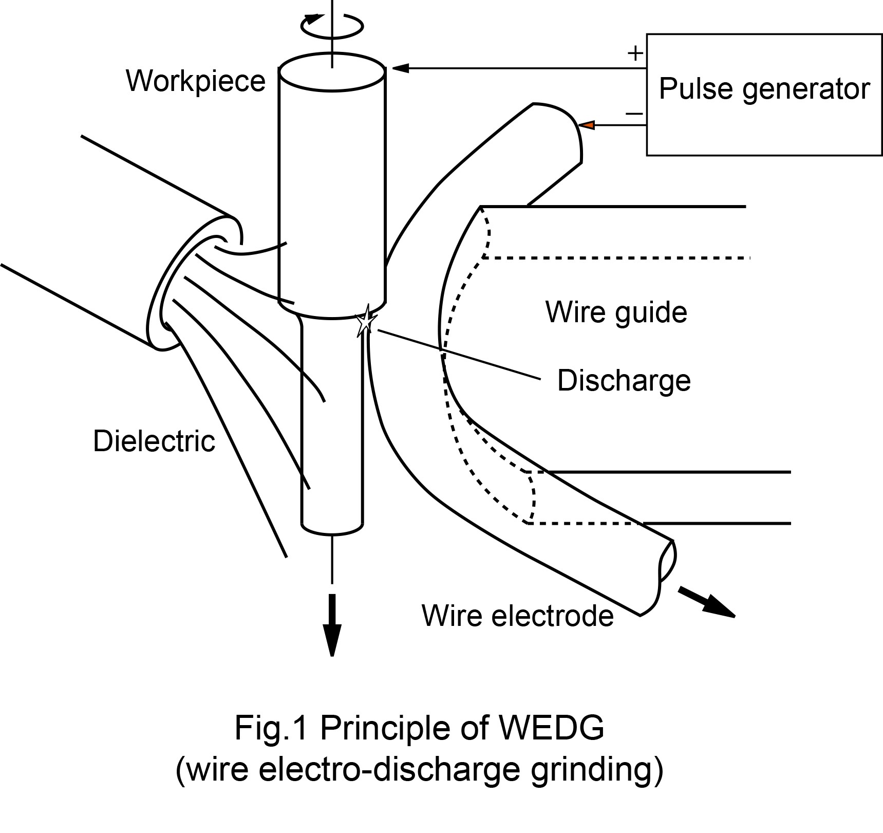 放電加工の一方式で、ガイドに沿って移動するワイヤの、ガイドに接する部分またはその近傍部分を電極として用い、放電により工作物を成形する方式である(図1)。加工液は掛け流す場合と、加工部分を浸漬する場合がある。図のような円筒形状のピンの他、工作物の回転の有無や数値制御による移動などで種々の形状加工ができる。ワイヤはワイヤ軸方向に移動するので電極消耗の影響を受けない。また、ワイヤ放電加工と異なりワイヤの振動やたわみの影響も受けないので、高い加工精度を実現できる。一方、細いワイヤ電極を用いるためあまり大きなエネルギのパルスを加えることはできない。このためこの方式は主として微細加工に適用される。微細加工用の放電加工機において微細な電極の機上成形用としてこの機能が搭載されることが多い。