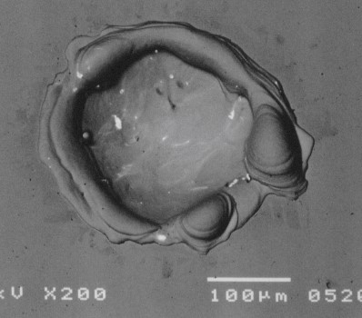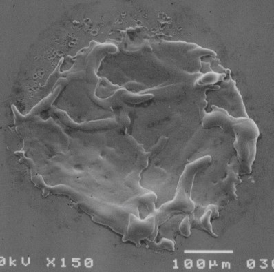 実際の単発放電痕を、図1、図2に一例を示す。図1はタングステンの細線電極を用いて放電加工油中で、電流値50A、パルス幅64µs、電極極性(+)の条件で炭素鋼表面(―)に生成した単発放電痕のSEM写真である。図2は電極極性を(―)に入れ替えた場合の、(+)極側となる炭素鋼表面に形成された放電痕である。極性の違いにより、生成される放電痕形状に大きな違いが生じていることが分かる。どちらも、周囲には溶融部が飛散しきれずに付着した盛り上がりが存在する。写真の条件では、細線電極と平板工作物の組合せで 単発放電を発生させているため、生成する気泡は半球状となる。一方、通常の形彫り放電加工では、 ある程度の大きさを持った電極で工作物を加工するため、発生した気泡は狭い極間を水平方向に拡大し、さらに連続的に放電が発生する。放電痕の形成に気泡内部の圧力分布の変化や、溶融部内部の温度圧力分布など複雑に作用すると考えられており、加工液の種類や極間距離などを含め、放電痕形状に与える要因は多い。最近では、発生する気泡の挙動を 高速度ビデオカメラで撮影することで、溶融材料の飛散タイミングを推察する研究も試みられている。