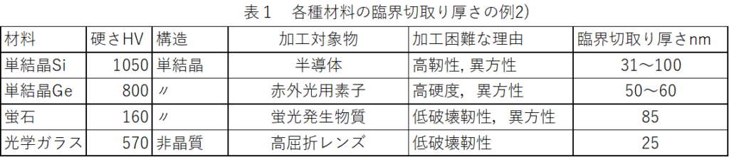 延性モードの場合、塑性変形と延性破壊の結果切りくずが生成されるので、切りくずは図2ⅰ)[5]に示すようにラメラ状(層状)のリボンのような形に、いわゆる流れ形に近くなる。脆性モードの場合、図2ⅱ)[5]に示すように塑性変形の証がない非常に細かくなった粉状のものやき裂形切りくずとなる。工作物はいずれもSi単結晶である。