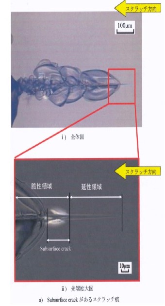 いることが認められる。同図ⅱ) の加工痕の拡大写真からもわかるように加工痕の形状から一見延性モード領域とみなされても、加工痕下にsubsurface crackが存在している部分が一部で認められる。通常の研削加工やラッピング等では、加工面表面粗さの5、6倍程度の深さまで表面層にクラックが生成されている[7]と言われており、同図のように加工痕から延性モードと一旦判断されてもこのsubsurface crackの存在に対して注意しなくてはならない。