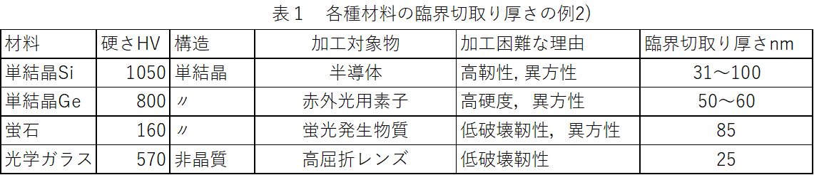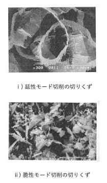 延性モードの場合、塑性変形と延性破壊の結果切りくずが生成されるので、切りくずは図2ⅰ)[5]に示すようにラメラ状(層状)のリボンのような形に、いわゆる流れ形に近くなる。脆性モードの場合、図2ⅱ)[5]に示すように塑性変形の証がない非常に細かくなった粉状のものやき裂形切りくずとなる。工作物はいずれもSi単結晶である。
