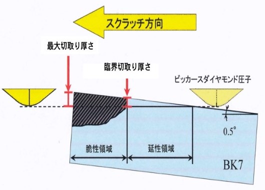 工作物が硬脆材料ゆえに延性モードで加工できる加工条件は限られており、特に切取り厚さが極微小である。延性モード切削での最大の切取り厚さを臨界切取り厚さ(以後dc値と略す)と称する。図1にガラスBK7の漸増切取り厚さ(切取り厚さを徐々に増加させていく)切削を行うことによって延性―脆性モード切削を一度に実施している例[1]を示す。板状の試料を水平からわずかの0.5°傾け、工具であるダイヤモンド圧子を右から左に速度V = 1000mm/minでスクラッチすると、工具の進行、すなわち切取り厚さの増加に伴って弾性変形(接触) → 塑性変形(延性破壊を伴う切りくず生成)→ 脆性破壊(脆性破壊による切りくず生成) へと順次進行する。脆性破壊によって切りくず生成が行われる直前の切取り厚さがdc値である。