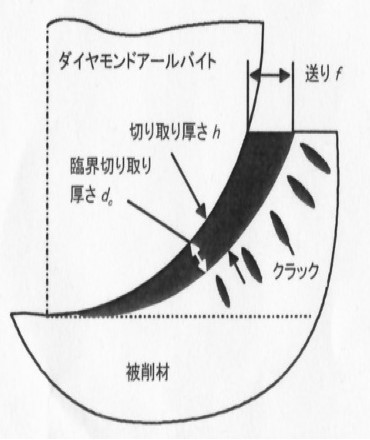 刃先にアールを設けたダイヤモンド工具による正面切削では、図5[13]のようになる。切取り厚さが工具刃先に沿って変化しており、図の下側近辺では延性モード加工が可能となっている。実用化の動きはなされているようだが、加工コストなどの問題があり、実現は容易ではないようである。