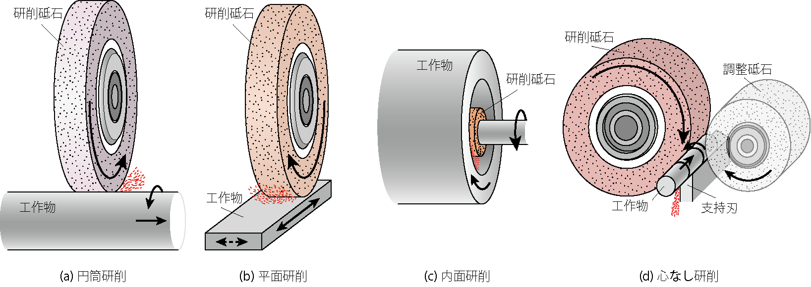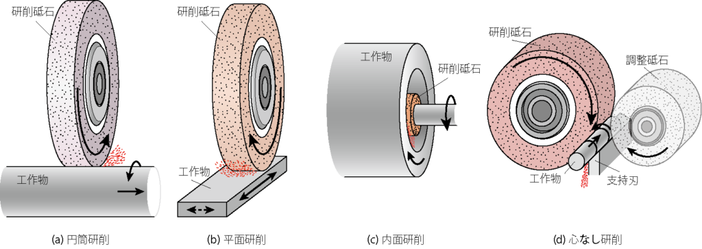 研削の主な作業方式には、図1に示すような円筒研削、平面研削、内面研削、心なし研削が挙げられ、これら以外にも歯車の歯面のプロファイル研削や切削工具の切れ刃の研削など、砥石と工作物の相対運動や砥石形状によって多岐にわたる研削作業の方式が実用されている。特に、近年では研削盤自体の精度やその運動精度ならびに制御技術がかなり向上し、エンジンのカムシャフトやクランクピンなどを高精度に研削する高度な技術も実現されている。さらに、研削盤や砥石の発展により研削の高速化が進んでおり、砥石周速度が200m/sの高速研削[1]も実用化されている。
