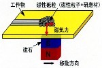 図1に磁気研磨法の加工原理を示す。非磁性工作物の表面上の磁性砥粒(磁性粒子+研磨材)は、工作物下面側に設置した永久磁石によって磁気力を受け、工作物表面を押し付ける。この磁気力が加工力となる。次に、永久磁石を右側に移動すると、磁性砥粒は永久磁石の移動に追従して運動し、工作物表面を精密研磨する。 磁気研磨法は、磁力線の物体透過現象を利用して、磁性砥粒の加工力と運動力を遠隔制御できる特長がある。このことから、磁気研磨法は細長い円管内面などの見えない箇所、通常の工具が届かない狭い箇所の精密研磨を実現させる。 応用分野には、パイプ内面の精密仕上げ、微細な凹凸面をもつ平面・曲面の精密仕上げなどがある。微細なバリ取り・エッジ仕上げにも適用できる。最近では、SUS304ステンレス鋼円管内面を3nmRaの超精密表面に創成できるなど、ナノレベルの超精密磁気研磨法の応用・実用化も可能になっている。