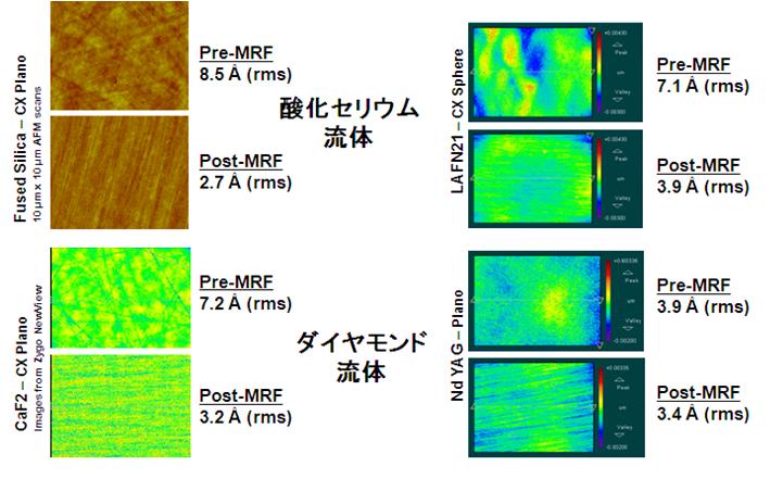 また面形状の改善に加えて、表面粗さも改善することが出来る。図4はその代表例である。ここでは溶融石英、LAFN21、蛍石、Nd:YAGの例を載せている。上の2例が酸化セリウム、あとの2例がダイヤモンドの研磨剤で磨いたものである。またそれぞれ上段がMRF前、下段がMRF後のデータである。表面粗さとしては、どの材料に対しても5Årms 以下を達成している。また剪断力による研磨であるがゆえに高い研磨率を得ながらも、従来の研磨のように研磨面に垂直な力がほとんど加わらないため、被研磨面に与えるダメージが非常に小さいという利点がある。研磨面に残存する応力やSSD ( Subsurface damage ) が少ない。