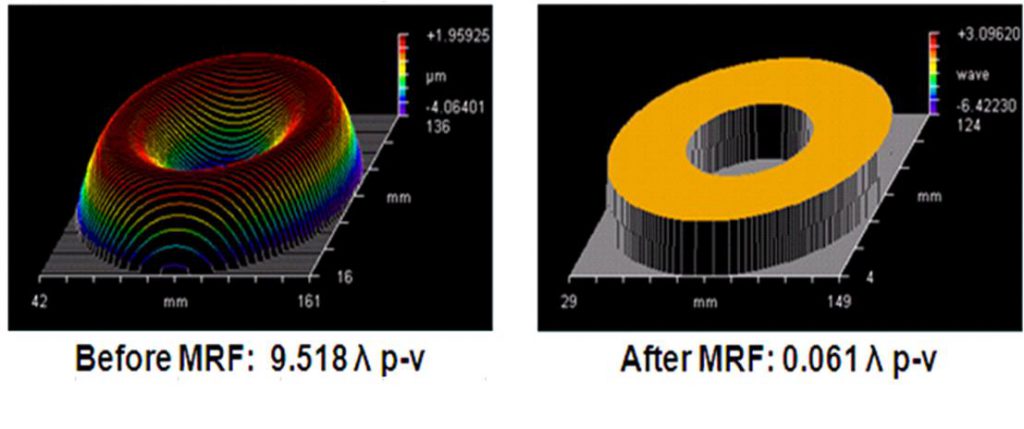最後にMRFによる研磨例を紹介する。図5は高精度球面レンズの研磨例である。(左がMRF前、右がMRF後の形状誤差データである。)直径105mmのレンズを2nm rmsの面精度まで到達させることができた。また単結晶材料であるCaF2(蛍石)の研磨も可能である。従来法では単結晶材料は結晶方位により研磨率が異なるため高精度な研磨は非常に困難であった。しかしMRFの場合容易に所望の面精度を達成することが出来る。また非球面の研磨はもっとも主要なMRFの開発動機の一つであった。MRF研磨ツールは流体であるので、研磨面の任意の位置の曲率に流体がなじみ、そのため各位置で安定かつ予測可能な研磨率が得られるため曲率の差によるSpotの変化をシミュレートでき、そのため非球面に対しても球面と同様の高精度な研磨が期待できる。図6は口径180mm、近似球面からの変位量が25μmの放物面を球面から創生した例である。干渉計を使って面形状測定を行いながら最終的にλ/15 PVを達成している。ちなみにこの図では設計値(放物面)からの誤差量を描いている。