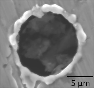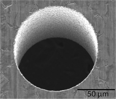 図1にSUS304に対して直径100μmの細穴放電加工したSEM像を示す。