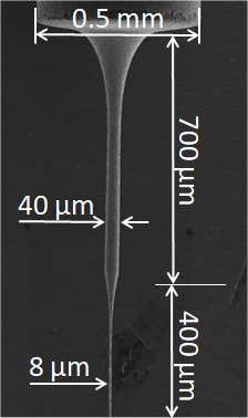 走査放電加工法による軸成形法が研究されており、細く長い軸が、短時間かつ高精度に成形できる[3,4]。図2に、走査放電加工法によって成形された軸のSEM像を示す。また図3に、走査放電加工法による軸成形法によって成形した軸を用い、細穴放電加工したSEM像を示す。直径10μmの微小径の細穴が加工されている。