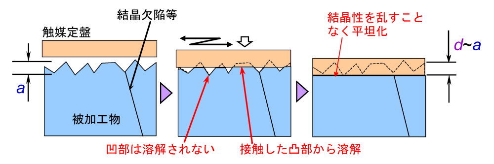 CARE法は、溶液中で被加工物表面と触媒表面とを接触・相対運動させることで、触媒表面に接触した被加工物表面凸部のみにおいて生じる化学エッチング(溶解)を利用し、加工変質層を導入することなく高効率な表面平坦化・平滑化を可能とする加工法である[1,2]。高硬度の触媒定盤を用いることで平坦化、軟質の触媒パッドを用いることで表面平滑化が行われる。触媒表面と接触しない被加工物凹部はエッチングされないことから、化学エッチングの選択性を有する結晶欠陥等が存在しても、それらの影響を受けることなく平坦化・平滑化される。