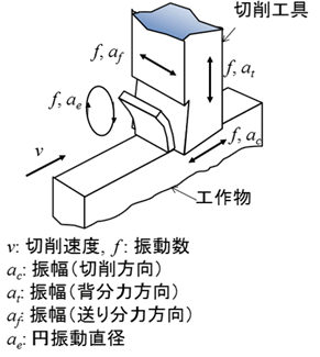 超音波振動切削法で用いられる各種の振動方向を図1に示す。通常の切削においては、工具と工作物との相対運動である切削速度 \( v \) のみにより切削が行われるが、超音波振動切削法においては、それに振動運動 \( ( f, a ) \) が追加される。超音波振動切削においては、切削速度に対する振動方向が切削特性に大きく影響を与えることになる。切削方向と同方向の振動 \( ( f, a_c ) \) は、バイトでの切削において多く利用されている方法で、振動の動きが切削面に与える影響が最も少なく、原則的な振動方向であるとされている。この切削法に関しては、隈部淳一郎博士により多くの研究がなされ、切削の原理、効果、あるいは実用装置が明らかにされている[1]