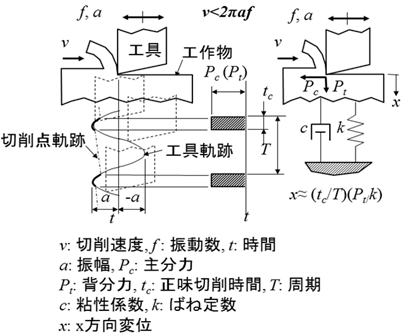 切削機構の概要を図2に示す。切削工具を切削方向と同方向に正弦波振動させて、振動の最大速度 \( v_v (=2 \pi af ) \) を切削速度 \( v \) よりも大きくすることにより、切削と非切削とが周期的に繰り返され、超音波領域での断続切削となる。すなわち、一般的に超音波振動切削を成立させるためには、\( v \lt 2 \pi af \) の関係を満足させる。振動最大速度が切削速度に対して高いほど、この切削法の効果がより顕著になってくる。切削抵抗は振動周期 \( T \) 毎に断続的に発生するパルス状の断続切削機構となる。このとき1パルスごとの正味切削時間を \( t_c \) とするとき、振動周期 \( T \) に占める正味切削時間 \( t_c \) の割合 \( t_c/T \) は切削特性を決定づける重要な因子である。この \( t_c/T \) は通常の利用範囲 \( ( v ≦ v_c / 3 ) \) では、振動速度 \( v_c \) に対する切削速度 \( v \) の割合 \( v /v_c \) にほぼ等しい。すなわち、前述のように、切削速度が低いほど切削特性が向上するので、生産性と加工精度とのバランスにより切削速度の条件が決定される。