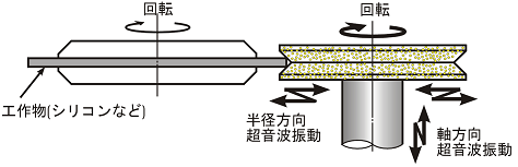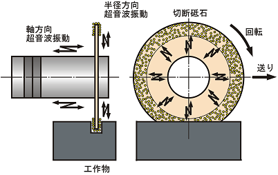 動に変換し、ガラスやシリコンの加工に適用されている。どちらも加工能率が向上することとダメージを受ける範囲が狭くなるのが特長である。延性材料を加工する場合は、キャビテーションによる目づまりの防止や研削時の摩擦低減によって研削抵抗の減少が期待できる。