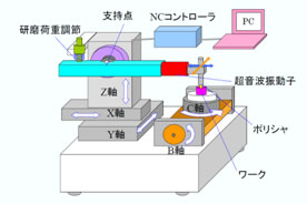 ランジュバン型の圧電素子を2重に重ねることにより2軸振動する超音波振動子を開発している(図1)。また近年需要が高まっている青色レーザピックアップレンズ用金型のように高NA非球面(高傾斜角をもつ)金型に対する自動超精密研磨加工に対応するために、この超音波2軸振動子を同時4軸(X,Y,Z,B)制御駆動テーブルに搭載し、非球面研磨システムを開発している(図2)。