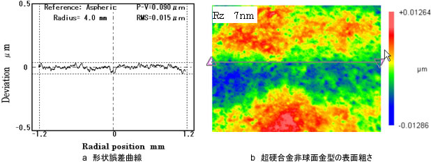 試作実験では2軸振動子の基本的振動特性の測定を行い、超硬合金に対する基本的な研磨特性を評価し、最後に、非球面研磨の可能性について検証している。0.1μmP-V以下の形状精度と10nmRz(2nmRa)以下の表面粗さを実現している(図3)。[1,2]