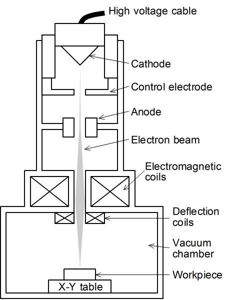 電子ビーム加工(Electron Beam Machining、略称EBM)は、10-4 – 10-5 Torr程度の真空中で高速運動する電子を集束させて高エネルギービームとして材料へ照射することで、電子の運動エネルギーの多くが熱エネルギーに変換されて材料を瞬時に加熱、溶融もしくは蒸発させて所望の形状に加工する熱加工プロセスであり、主に金属材料の穴あけ、切断、および溶接等に用いられている。