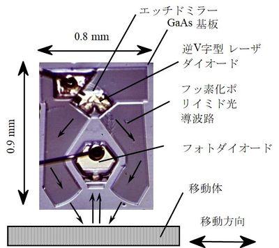 Fig.1 の集積化レーザドップラ速度センサは、光のドップラ効果を用いて、対象物の速度を計測するセンサで、GaAs基板上にレーザダイオード・フォトダイオード・光導波路を半導体プロセスを用いて作り込むことにより1mm角以内に集積化したセンサである。従来のレーザドップラ速度計測器に比較して1/100以下のサイズである。測定対象を毛細血管内の赤血球とすることで、非侵襲な血流計にも応用されている。従来の光計測器は、光部品を光路上に正確に配置(アラインメント)する事が難しく、サイズ・コストが大きくなりがちであった。これに対しMOEMS(光マイクロマシン)は、設計通りに基板上に一度に形成されるため、上記光部品アラインメントを廃することができ、小型化・低コスト化が可能である。MOEMSの例としては、他にマイクロエンコーダ(変位センサ)・波長可変レーザなどがある。製品化された例としては、プロジェクタ用マイクロミラーデバイスが挙げられ、半導体プロセス用マスクレス露光装置にも使われている。