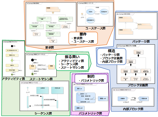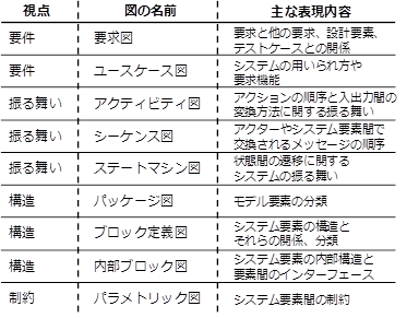 SysML ( Systems Modeling Language )[1,2] とは、システムの分析、仕様決定、設計、検証、妥当性確認を行うための汎用図式モデリング言語である。対象とするシステムには、ソフトウェア、データ、人員、手続き、設備、人工的あるいは自然の他の要素が含まれる可能性がある。SysMLはシステムの要求、振る舞い、構造、プロパティ、およびそのコンポーネントを表すための意味論的基礎を持っており、航空宇宙や自動車などの産業領域の広いシステムのモデリングを目的としている。 SysMLは図1に示すように表現内容の異なる4つの視点、9つの図から構成されている。4つの視点とは、要件、振る舞い、構造、制約であり、それぞれの視点に対し1-3の用途の異なる図が存在する。表1に各図の主な表現内容を示す。ただし必ずしも全ての図を用いる必要はない。