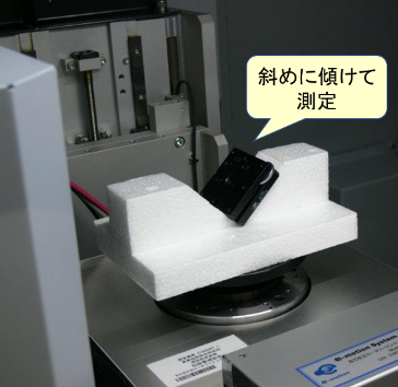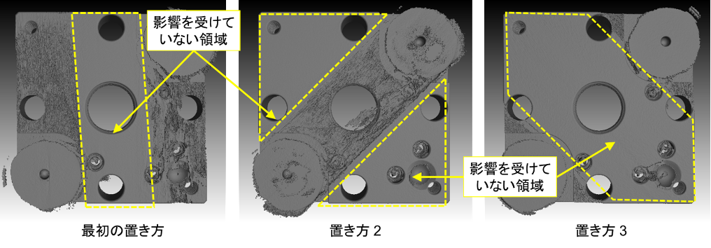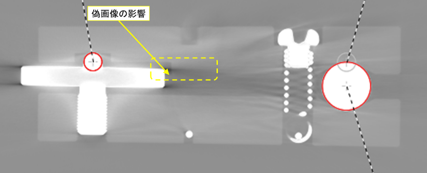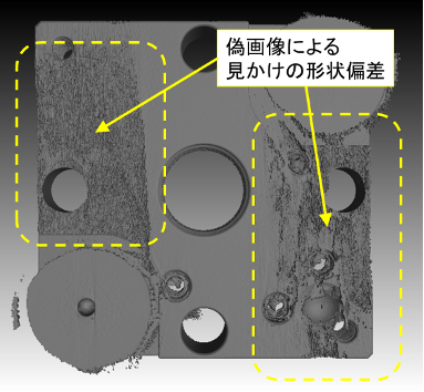 X 線 CT による形状計測では、物体表面の座標値を断層撮影による再構成データから間接的に取得するという原理から、測定結果が偽画像[2] の影響を受けやすく(図4)、本来の物体表面には存在していない見かけの形状偏差が、抽出された境界面に生じることが多い(図5)。そのため小さい不確かさで測定を行うためには、測定時に測定物の設置姿勢を変更する(図6、図7)、プレフィルタを適用する、などの工夫をする必要がある。また境界面抽出のアルゴリズムや決定時に設定する閾値によって、決定される境界面の位置が変化することから、安定的に寸法・形状測定値を得るためには、事前に境界面決定の方法について定めておく必要がある。